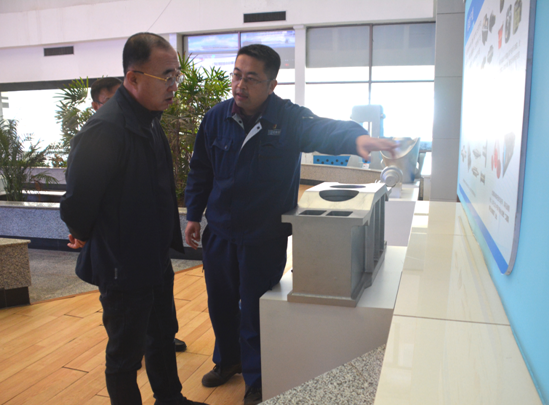 郭旭東陪同趙新明一行參觀一樓展廳,并詳細介紹了公司產(chǎn)品和工藝流程。